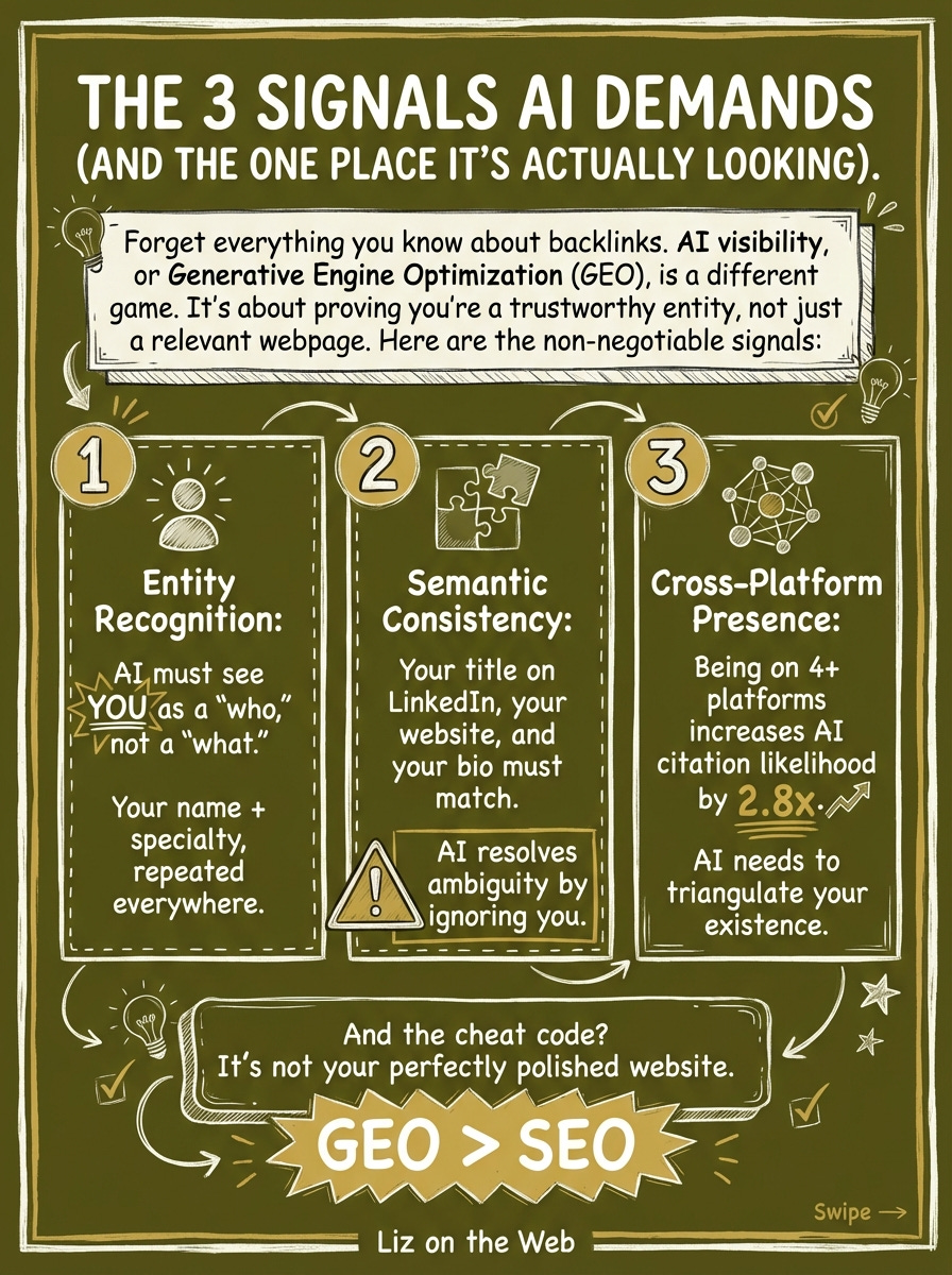 Google rewards keywords and backlinks. AI rewards clear identity and strong signals that you are a known authority.