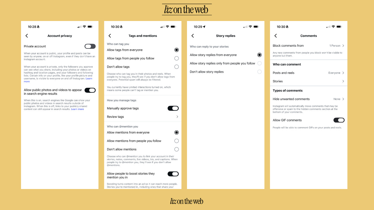 Here are all the settings that you can access by clicking “Settings and activity” from your profile (“Settings and activity” is the 3 line “hamburger” menu at the top right of your Instagram profile in the phone app):